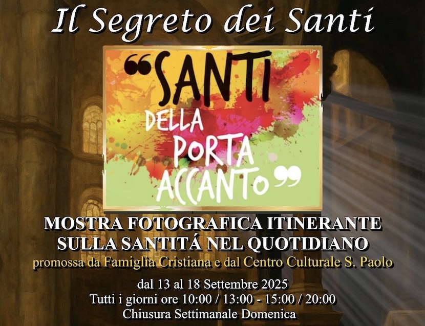 Sabato 13 Settembre alle ore 19:00 si terrà il Vernissage della Mostra Fotografica Itinerante sulla Santità nel quotidiano "I Santi della porta accanto", promossa da Famiglia Cristiana e dal Centro Culturale S. Paolo. Il percorso sarà introdotto da Virginia Barrett.